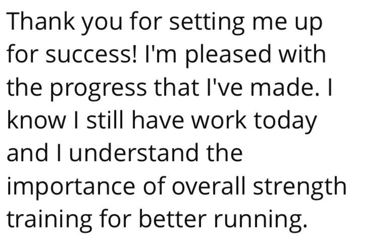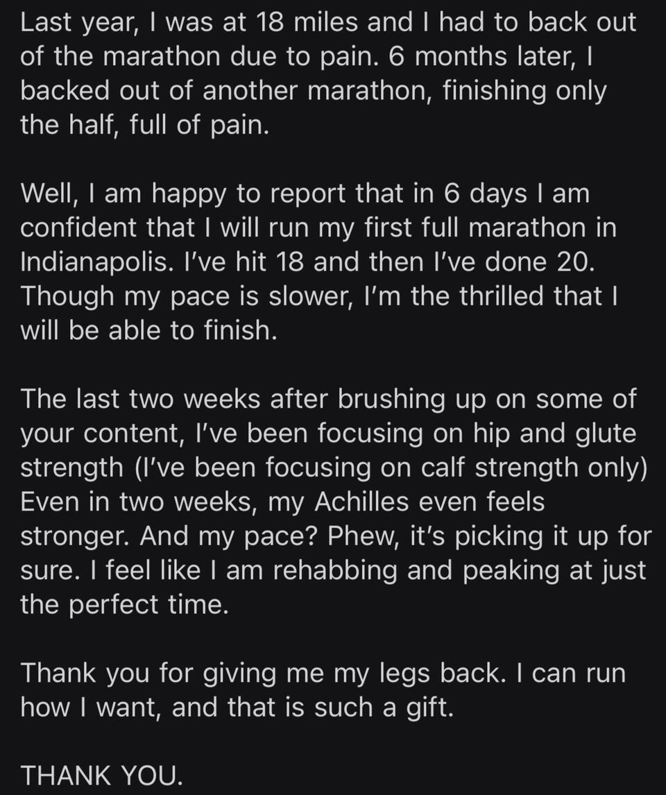 ❌ Talented athletes lose hope because cookie-cutter PT plans didn't match the realities of what runners actually needAnd honestly? It made me furious.Because the solution was right there... hiding in plain sight.One day, after working with yet another frustrated runner who'd done "everything right" and was still in pain, it hit me:They don't need more rest.They don't need another stretch routine.They need the RIGHT loading strategy, one that's actually designed for runners.So I built it.Not a bloated course.Not another PT protocol or a gimmicky device that takes months.Just the core strength, mobility, and running progressions that actually move the needle.The results?✅ Runners like TJ going from 2 years of pain to 60+ mile weeks in 12 weeks