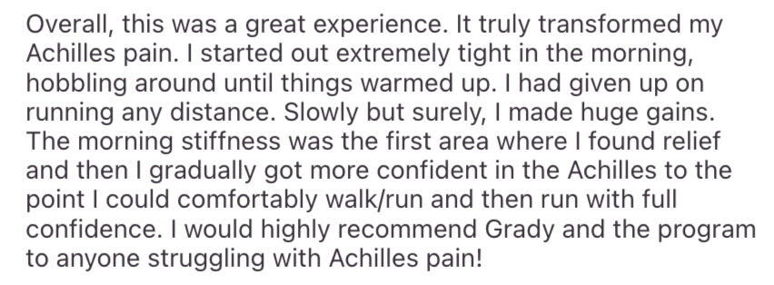 You can get the same breakthrough TJ had.The exact system that took him from 2 years of failed treatments to 60-70 pain-free miles per week.Here's what changes when runners build Achilles tendon resilience:✅ Stop wasting time on treatments that don't work... No more PT appointments, no more "just rest," no more hoping this week will be different)